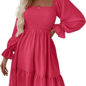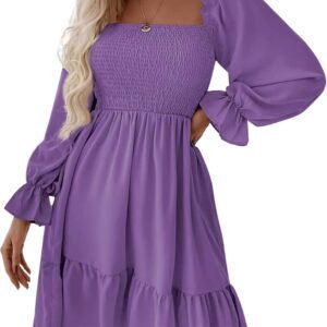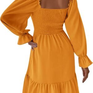 Women Square Neck Lantern Long Sleeve Ruffle Shirred Flowy Party Mini Dress