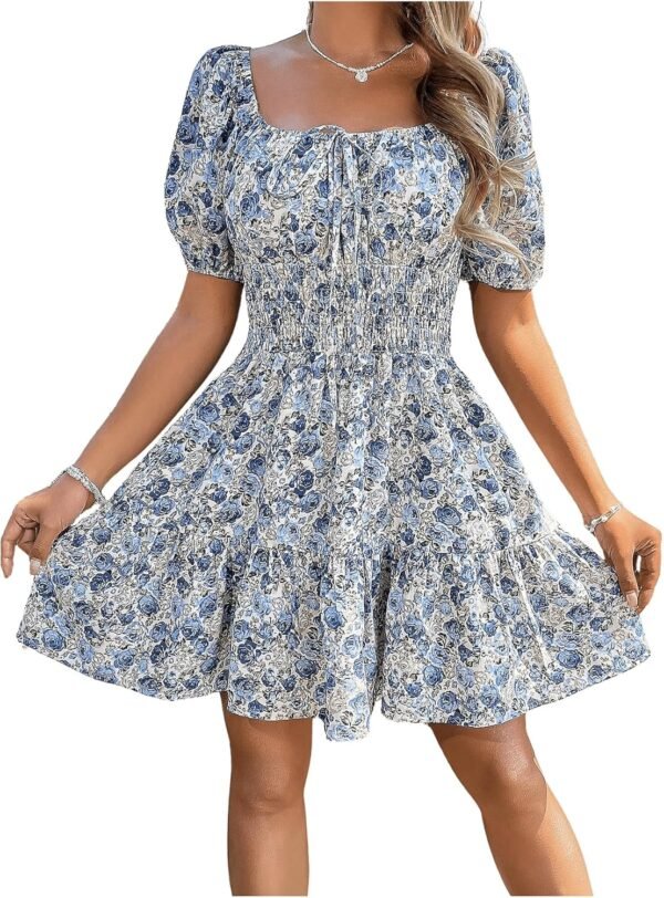 • Feature: Floral print, puff short sleeve, square neck, shirred detail, ruffle hem, a line short dress