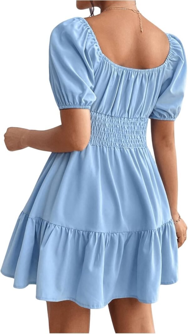 Women Boho Square Neck Puff Short Sleeve Self Tie Front A Line Dress