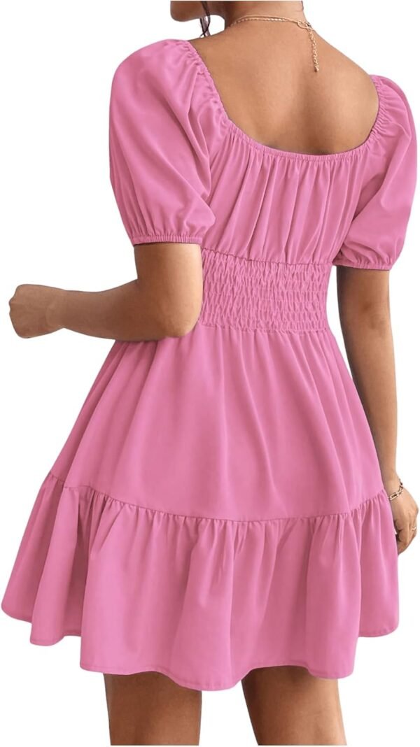 • Feature: Floral print, puff short sleeve, square neck, shirred detail, ruffle hem, a line short dress