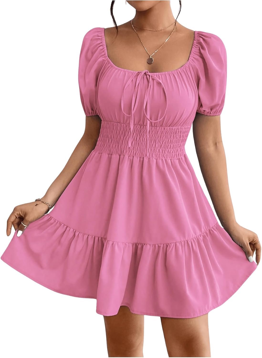 Women Boho Square Neck Puff Short Sleeve Self Tie Front A Line Dress