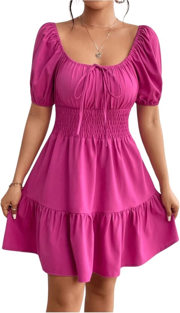 Women Boho Square Neck Puff Short Sleeve Self Tie Front A Line Dress