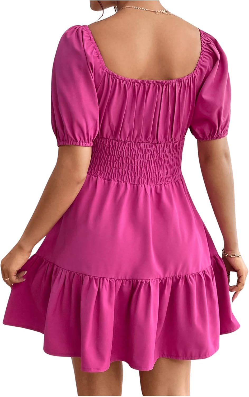 • Feature: Floral print, puff short sleeve, square neck, shirred detail, ruffle hem, a line short dress