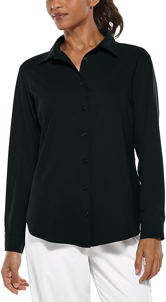 - FEATURES: Relaxed fit, center front button down placket and curved bottom hem; 30 1/8 inch body length (size medium); Machine wash, tumble dry; Imported