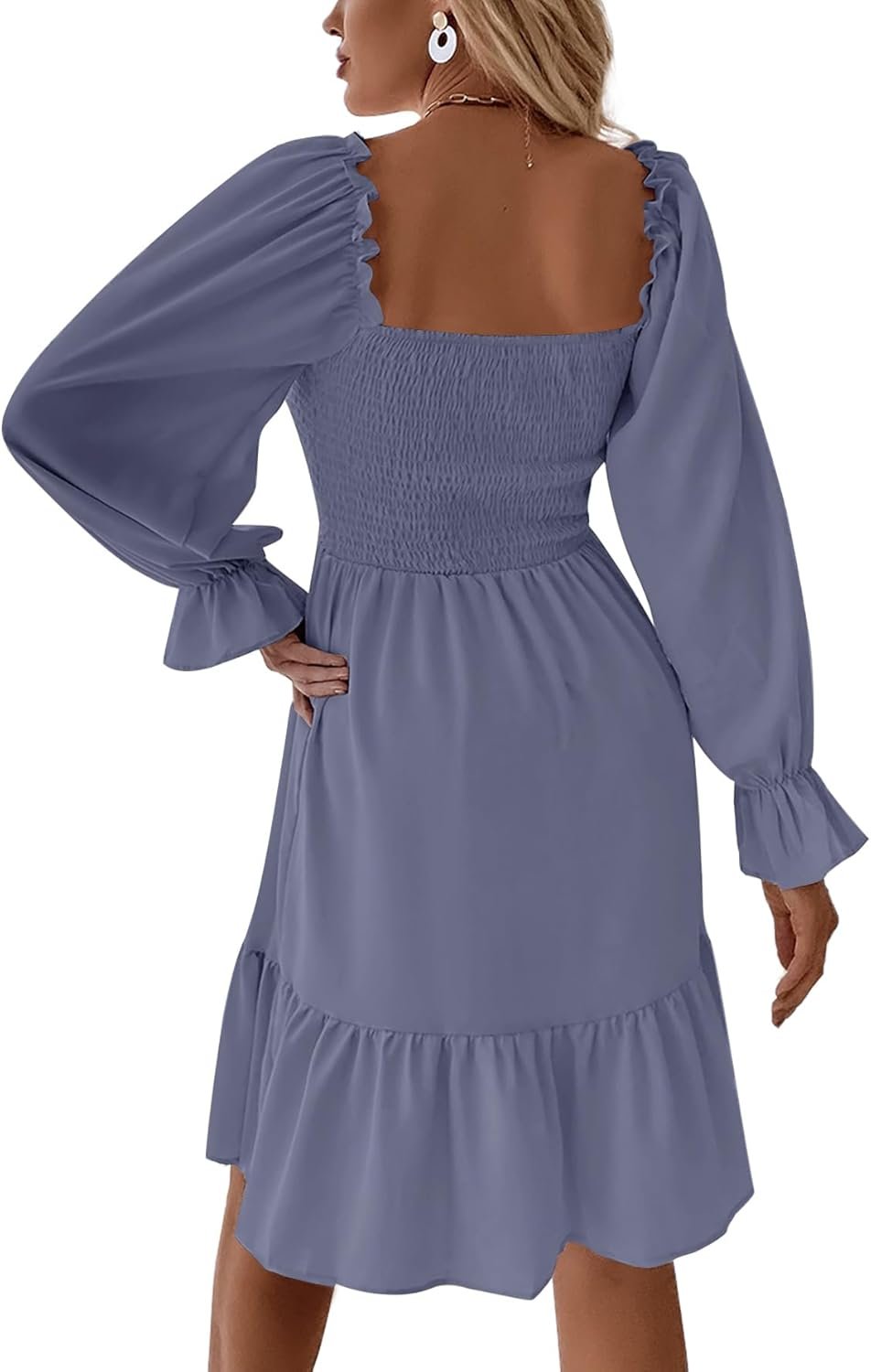 Women Square Neck Lantern Long Sleeve Ruffle Shirred Flowy Party Mini Dress
